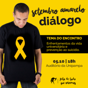 No dia 05 de outubro de 2017, às 18h, no Auditório do Campus São Borja, ocorrerá a Roda de Conversa alusiva ao mês de prevenção ao suicídio (setembro amarelo).