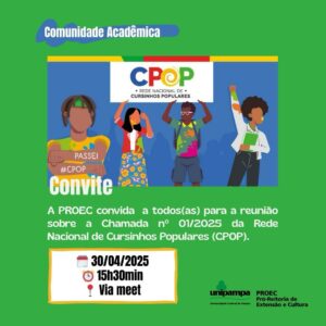 A Pró-reitoria de Extensão e Cultura (PROEC), da Unipampa, convida a todos(as) para uma reunião para tratar da Chamada Pública nº 01/2025, da Rede Nacional de Cursinhos Populares (CPOP).