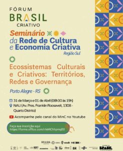 O Fórum Brasil Criativo – Região Sul ocorre em conjunto com o Seminário da Rede de Cultura e Economia Criativa da Região Sul, reunindo diferentes instituições e atores do campo cultural.