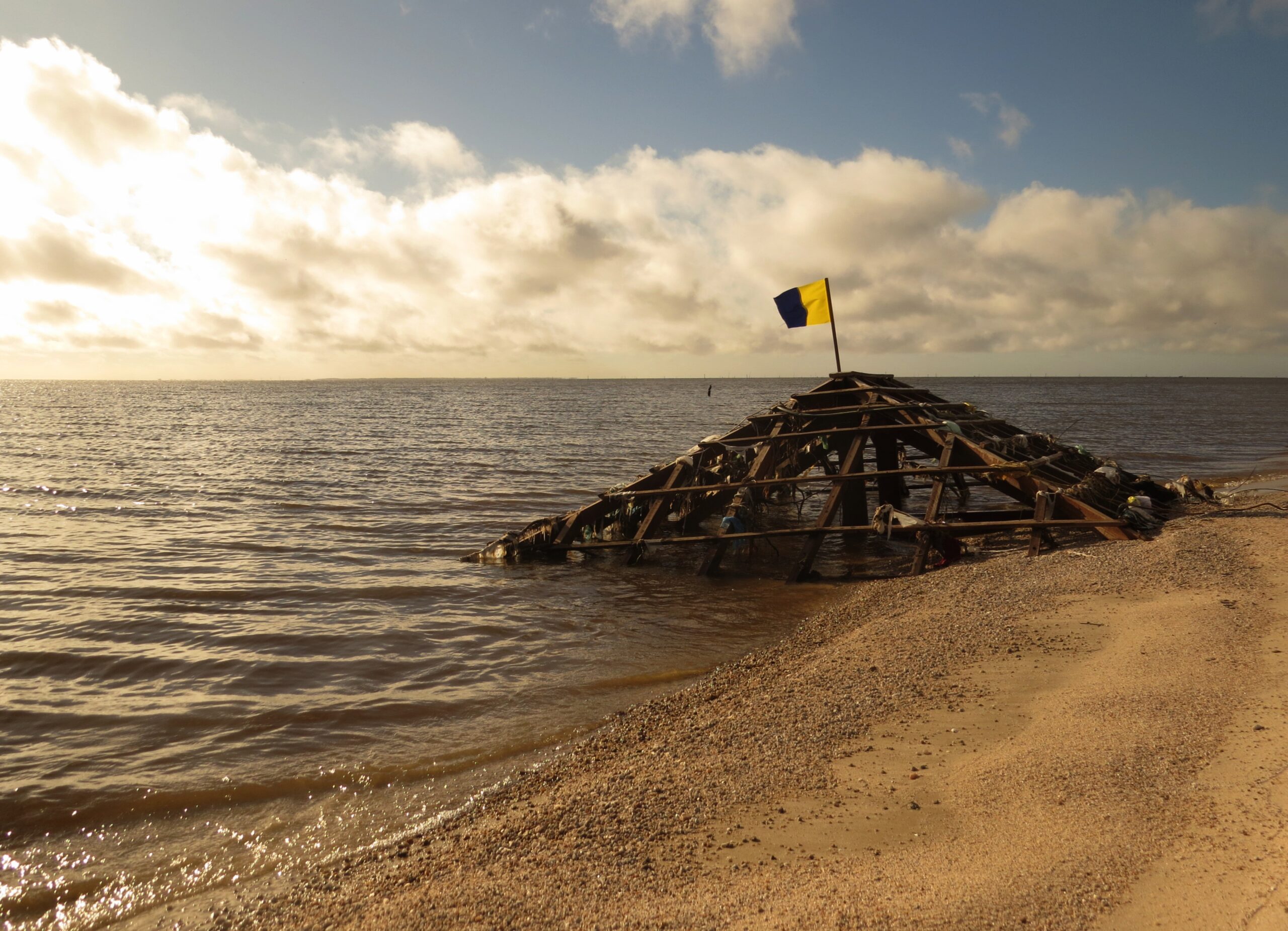 Nome da obra: Mergulho Depois do Silêncio (Bandeira de Sinalização Náutica “Kilo” Instalada em Teto de Cabana Encalhada na Lagoa dos Patos após Enchente)