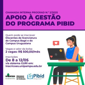 A Chamada Interna Prograd n.º 02/2025 (link externo, arquivo em PDF) tem como finalidade dar suporte à Coordenação Institucional do Programa Institucional de Bolsa de Iniciação à Docência (PIBID), bem como apoiar os(as) discentes bolsistas e voluntários, em colaboração com os(as) docentes coordenadores(as) de gestão, coordenadores(as) de área, supervisores(as), que fazem parte do Programa, na realização de atividades determinadas pela coordenação institucional, no desenvolvimento de atividades síncronas e assíncronas.