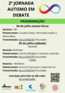 A 2ª Jornada Autismo em Debate, promovida pelo Núcleo de Estudos em Inclusão – NEI -, e parceiros, ocorrerá nos dias 4 e 5 de julho de 2025, com transmissão pelo