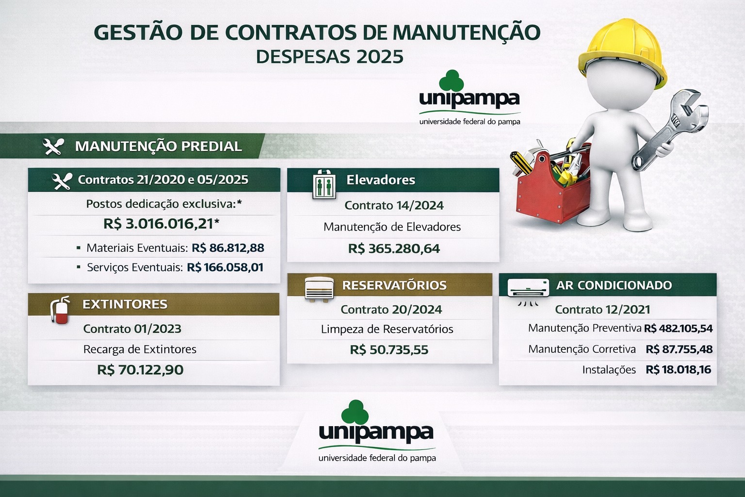 A Coordenadoria de Manutenção da Unipampa divulga os valores dos contratos referentes ao ano de 2025. Os contratos contém diversos serviços essenciais à operação e conservação das instalações.