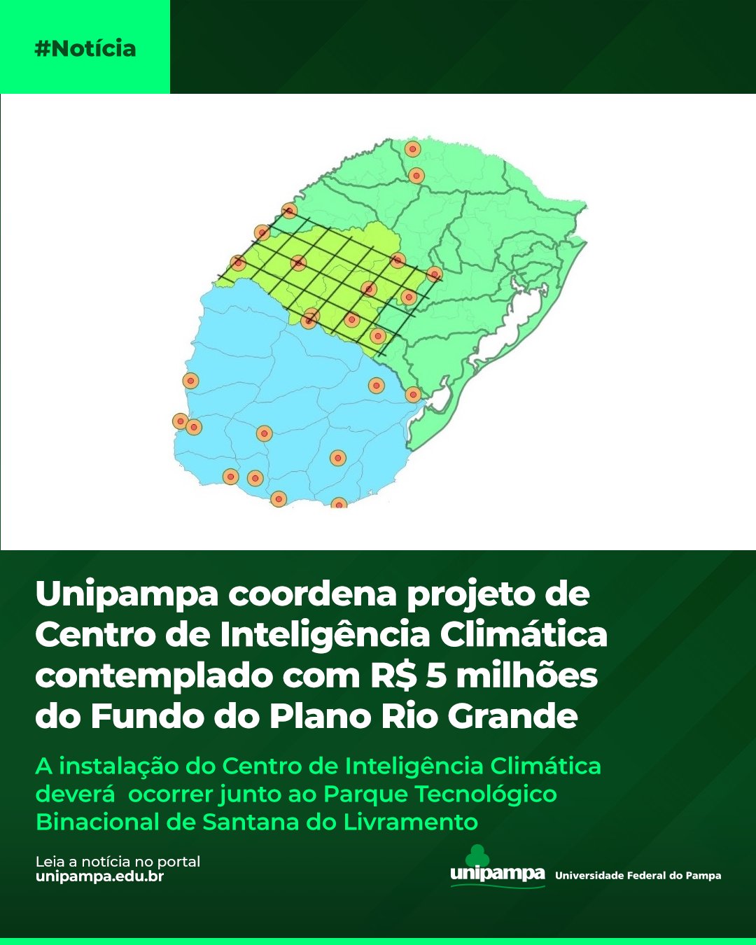 O projeto do Centro de Inteligência Climática (CIC) foi contemplado com financiamento de R$ 5 milhões, do Fundo do Plano Rio Grande (Funrigs), no eixo Governança. A decisão foi tomada em reunião do Comitê Gestor do Funrigs, realizada no dia 26 de agosto, e publicada por meio da Resolução nº 24/2025, na edição de 4 de setembro do Diário Oficial do Rio Grande do Sul. O projeto foi elaborado por um grupo de trabalho coordenado pela Universidade Federal do Pampa (Unipampa), com participação da Universidade Federal de Santa Maria (UFSM) e da Universidade Tecnológica do Uruguai (UTEC).