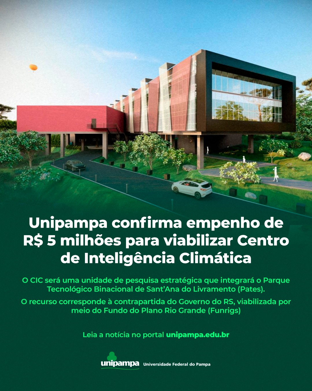 A Universidade Federal do Pampa (Unipampa) confirmou, na quinta-feira, 18, o empenho dos R$ 5 milhões destinados à implantação do Centro de Inteligência Climática (CIC), unidade de pesquisa estratégica que integrará o Parque Tecnológico Binacional de Sant’Ana do Livramento (Pates). O recurso corresponde à contrapartida do Governo do Estado do Rio Grande do Sul, viabilizada por meio do Fundo do Plano Rio Grande (Funrigs).
