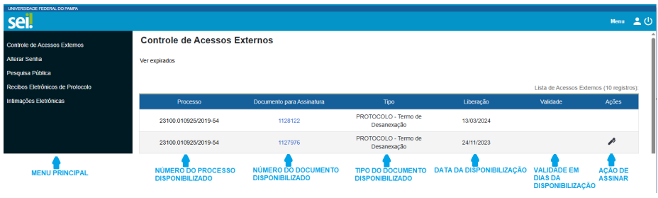 Se usuários das unidades da UNIPAMPA desejam conceder acesso a um usuário externo, deverão clicar no processo desejado e no documento alvo de assinatura externa. Para melhor visualização, assista aos vídeos abaixo ou, no menu Como Usar o SEI, existe um Pop para orientação, ou acesso o Manual Digital Trilhas do SEI.